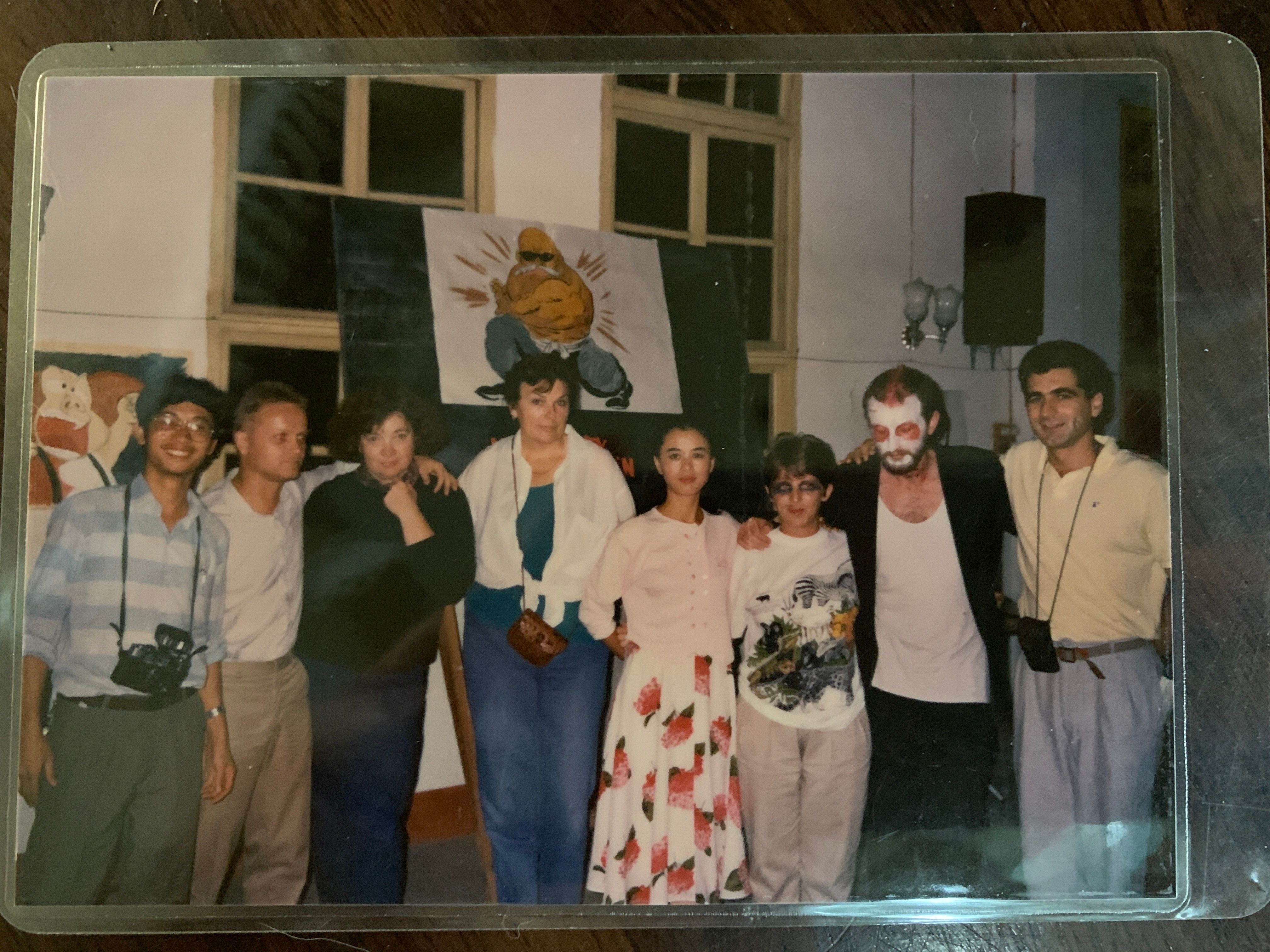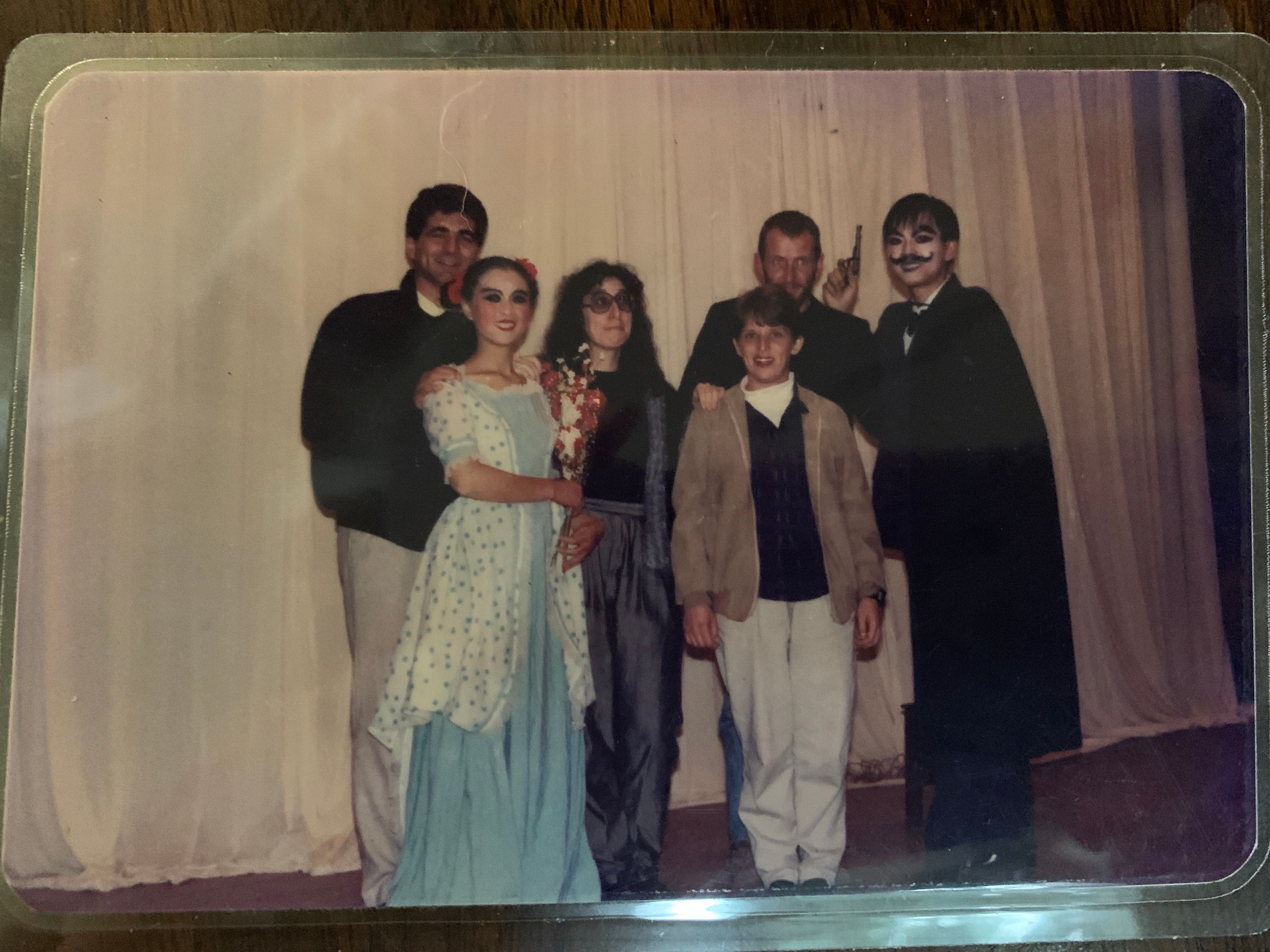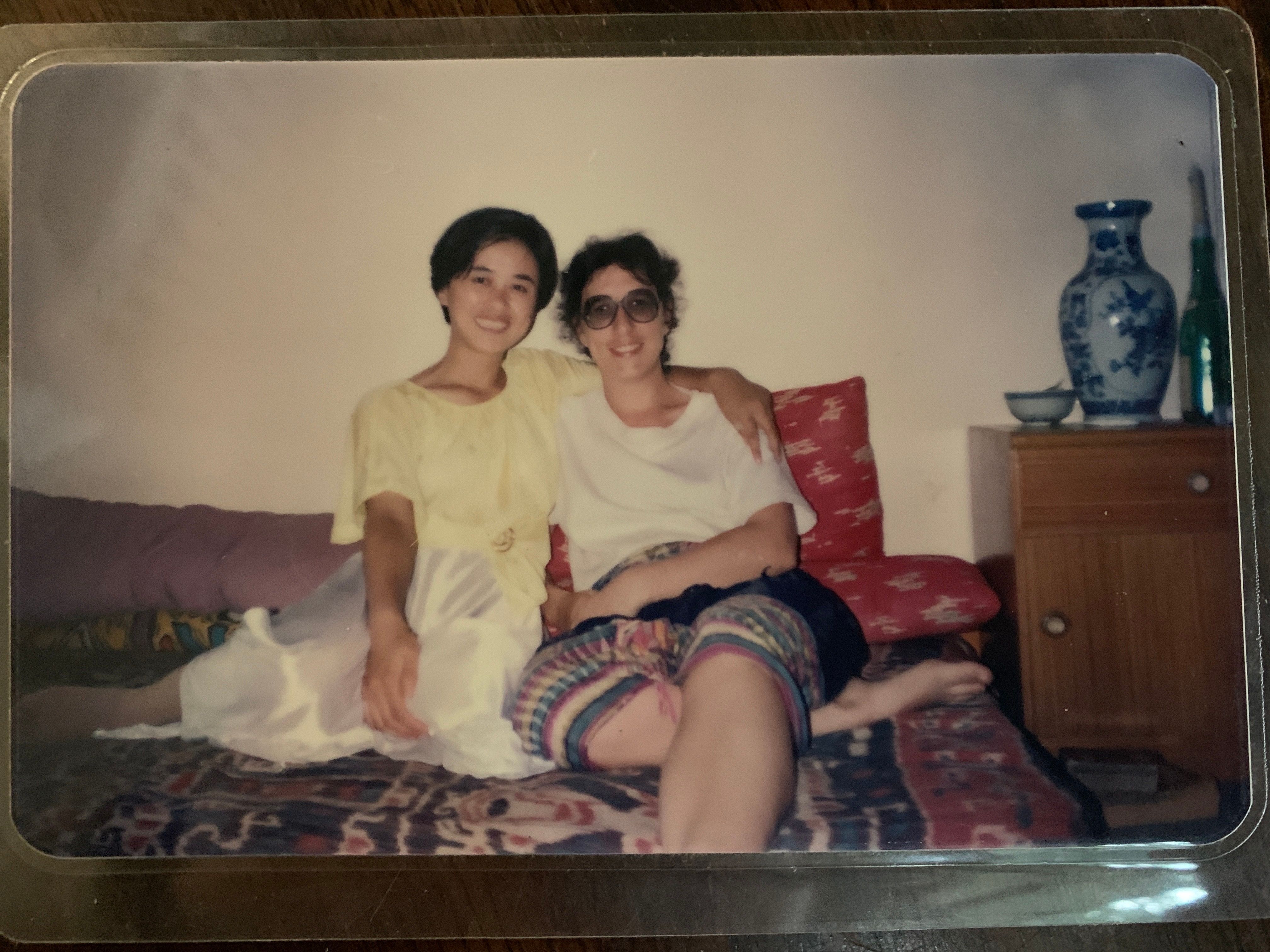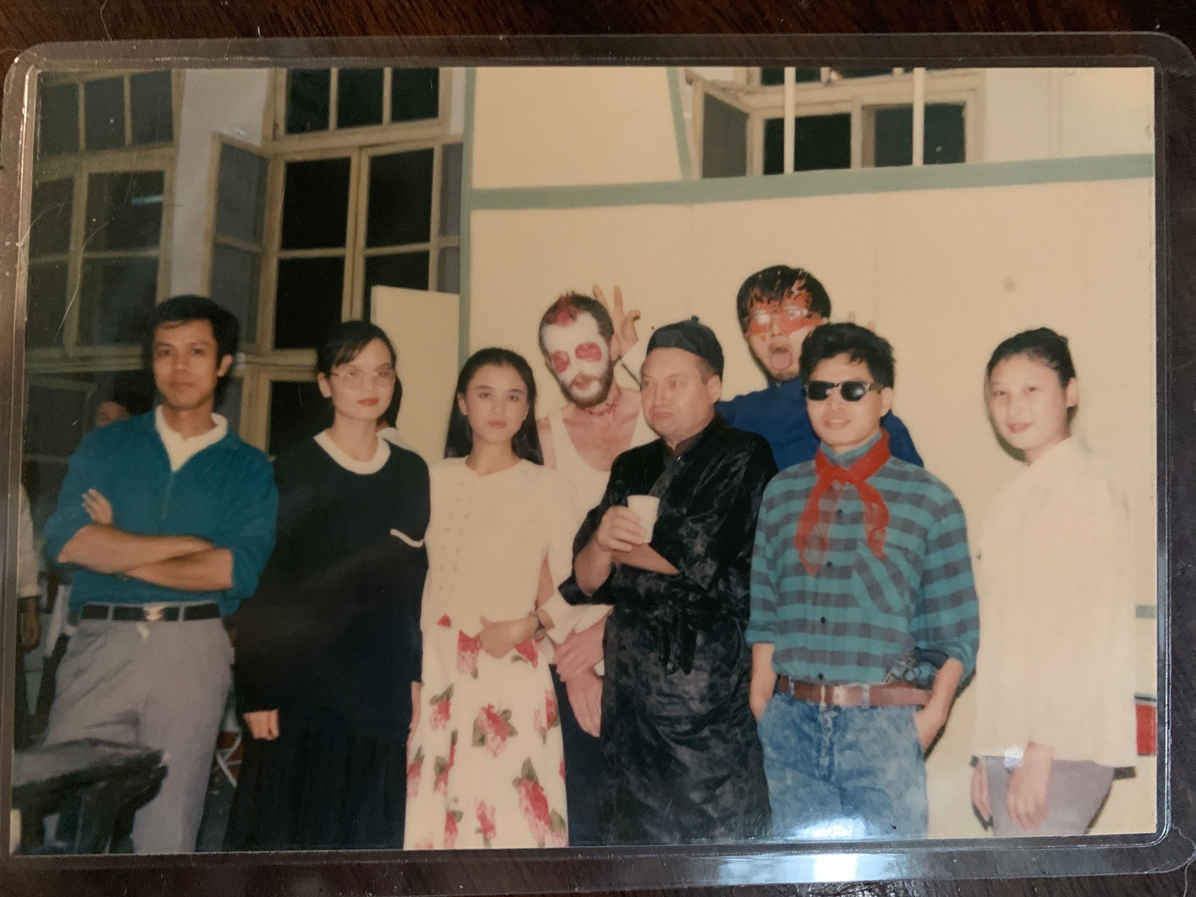决定万里送女英国留学后,我便与最近才取得联系的外教恩师Val 提前相约相聚。32年前Val 受英国文化协会委派赴穗广外教授英语。她的教学形式活泼生动,广受同学们喜爱。我成为她的得意门生,经常受邀在她的外教专家楼里一起做饭聊天(图一)。作为文艺部长的我,担任女主角和剧务主任协助老师推出了广外首场英语情景话剧《红仓库的谋杀案》(Murder in the Red Barn)。我饰演的村姑Maria 被要去伦敦追求富婆的花花公子William抛弃并谋害。这是一个一切都对不上拍的喜剧。乐队不和节拍的伴奏,场景换错的小伙子,William 的手枪举起不响,放下却炸。笑料百出,喜不自禁。赢得满堂喝彩。我在迎新会上首次和高年级同学无排练即兴表演小品《打针》后,第二次与同学合作表演的喜剧作品就是Val 老师的导演的。我的戏剧课也因此获得高分……