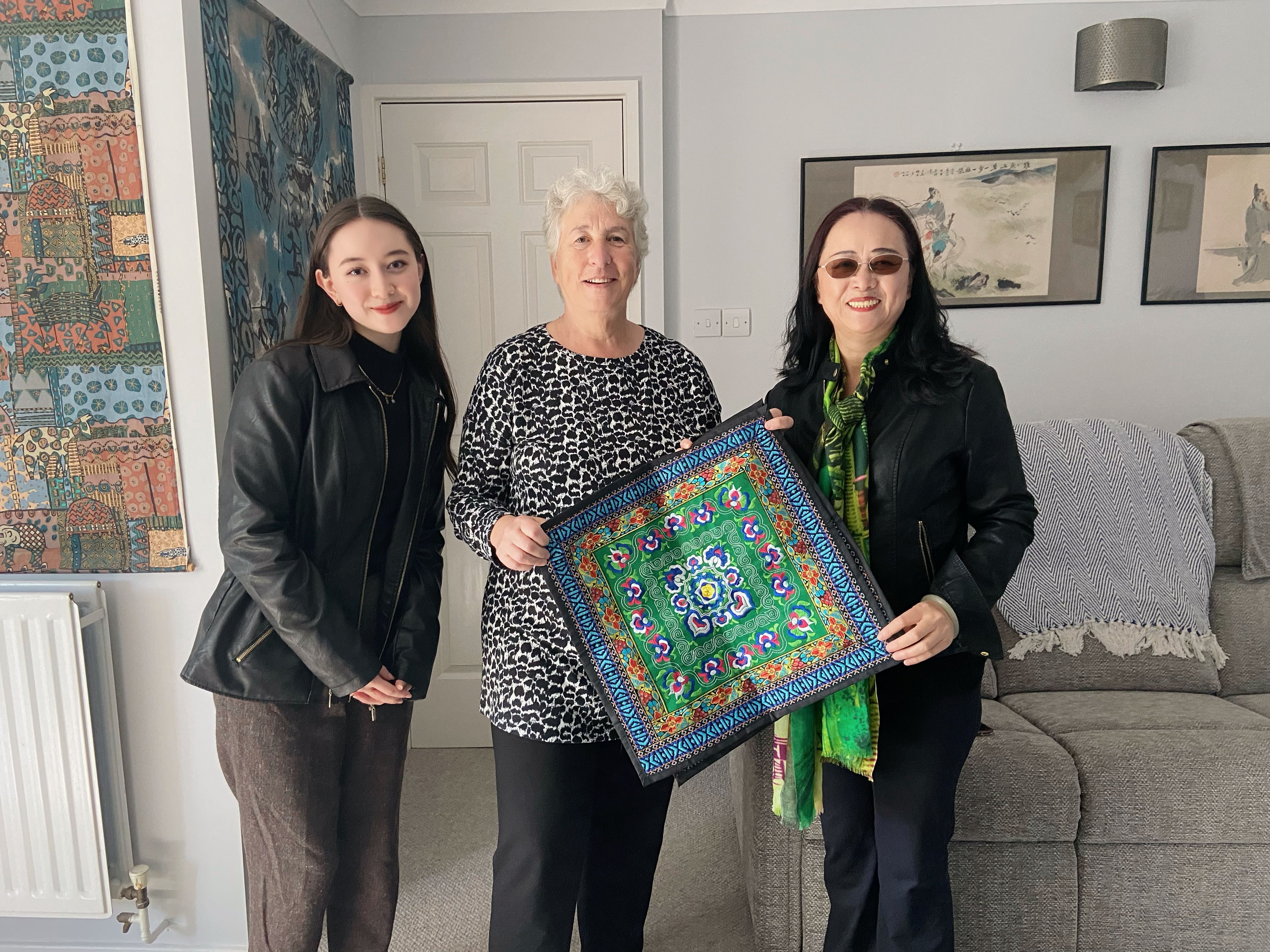 随后,老师把我们迎回家中,热情地为我们泡茶煮咖啡。我也取出精心准备的两件礼物:2019年云南丽江行带回美国的抱枕刺绣(图六)和丝绸方巾(图八)。我知道老师的喜好。果然老师爱不释手,马上就把方巾围在脖子上。