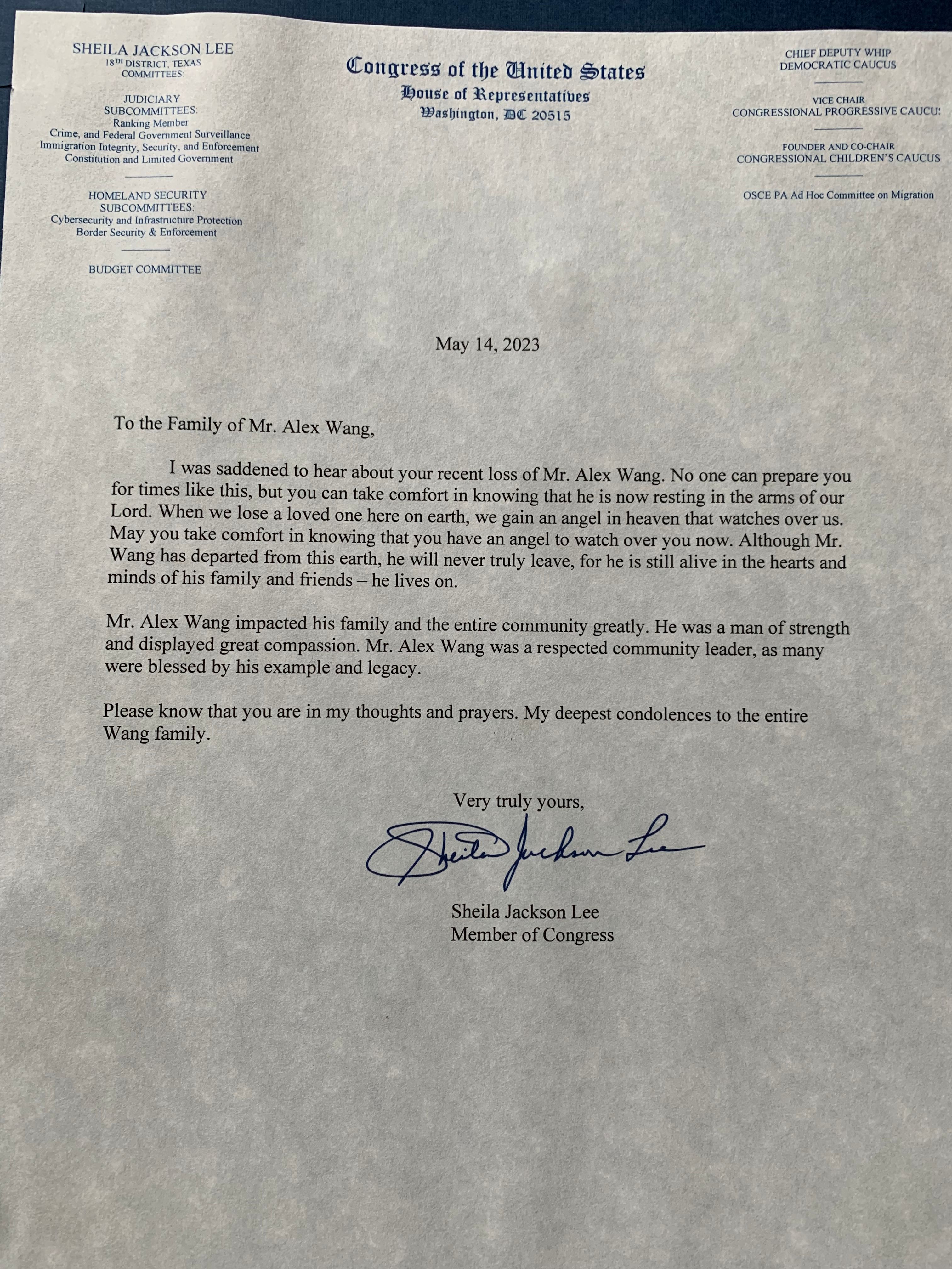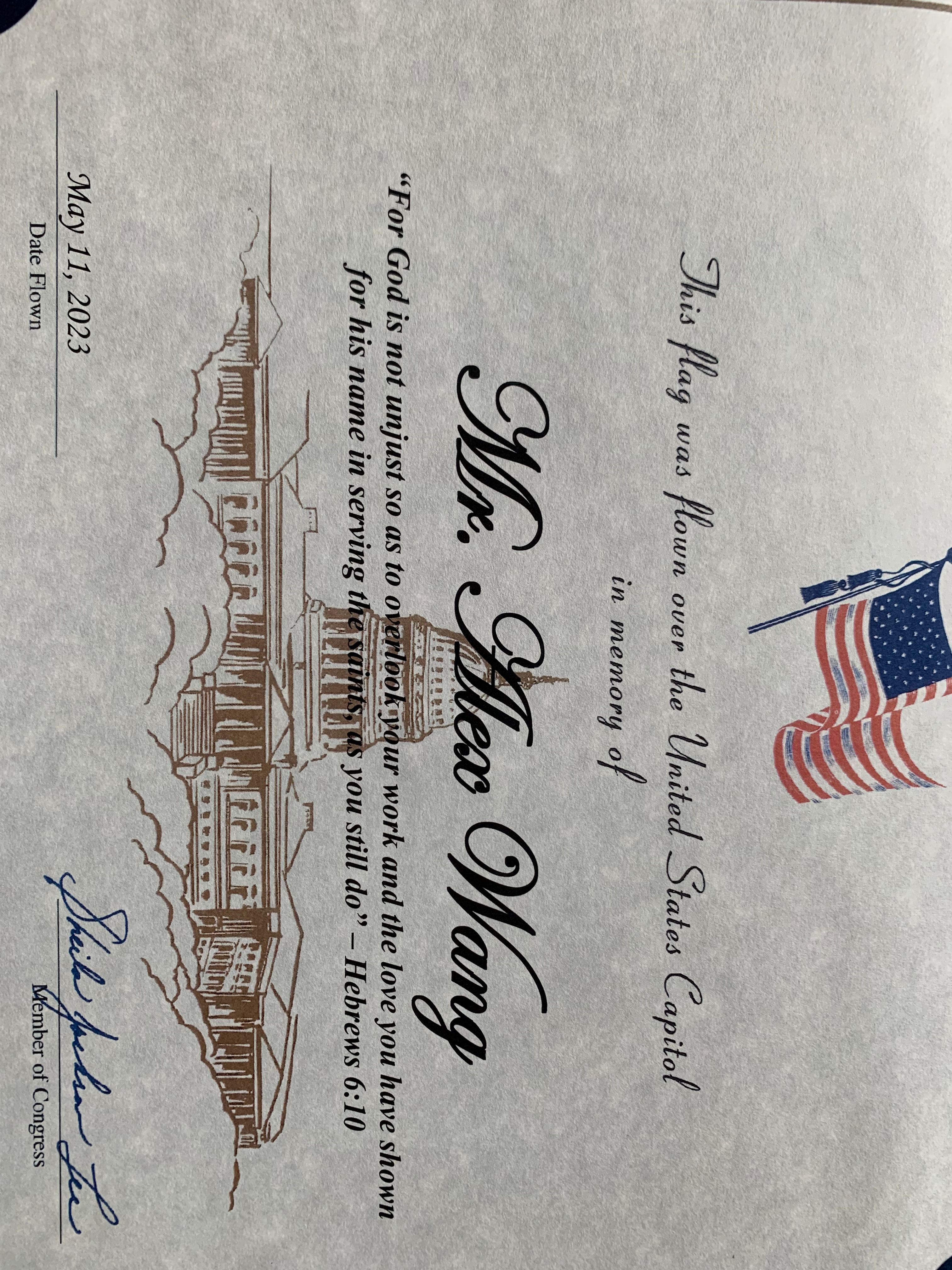 I also want to thank Congressman Al Green for coming with another flag flown over the Capital to commemorate Alex Wang. Thanks to all elected officials and representatives, community leaders, and volunteers, especially thanks to friends of Alex who put all the efforts together to give Alex a glorious funeral service by raising funds and volunteering!