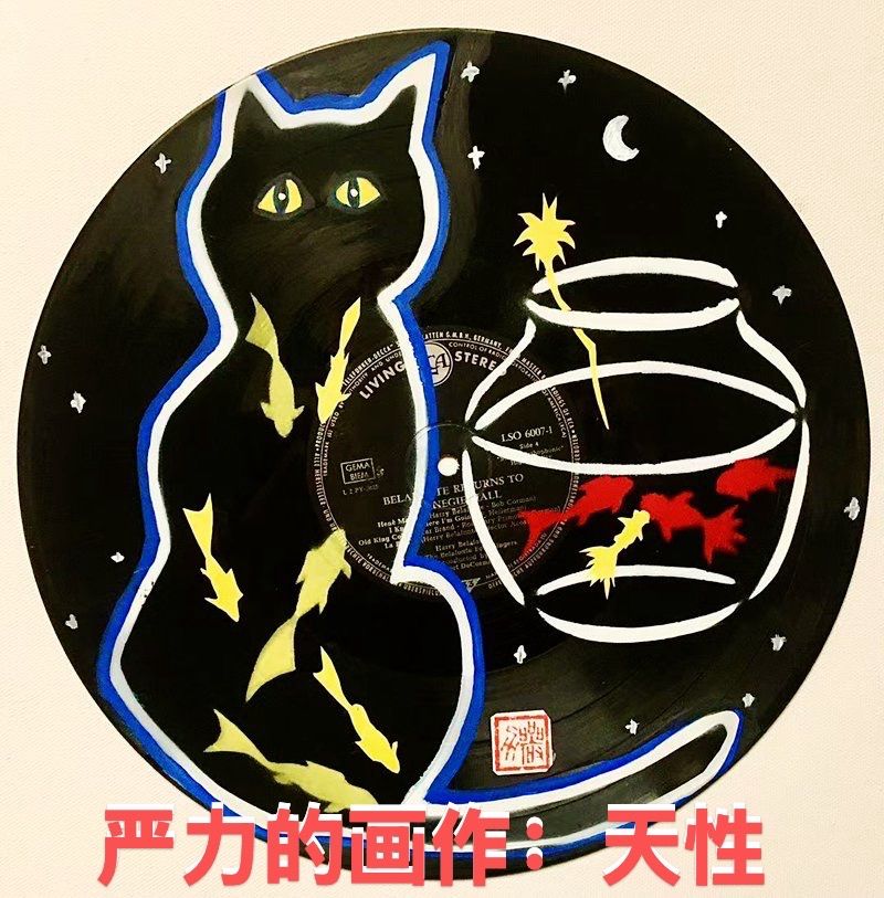 在严力的画室中,各种风格、各种材质、各种流派、各种特色、极简或极繁的油画让人目不暇接。赏画中我的视线停在一幅充满童趣的星空下的黑猫上,严老师突然问我:“你养了小猫吧?”“你怎么知道?”严老师笑了:“你看我这幅猫咪的画,眼睛立刻亮了。”画家的眼力果然了得。