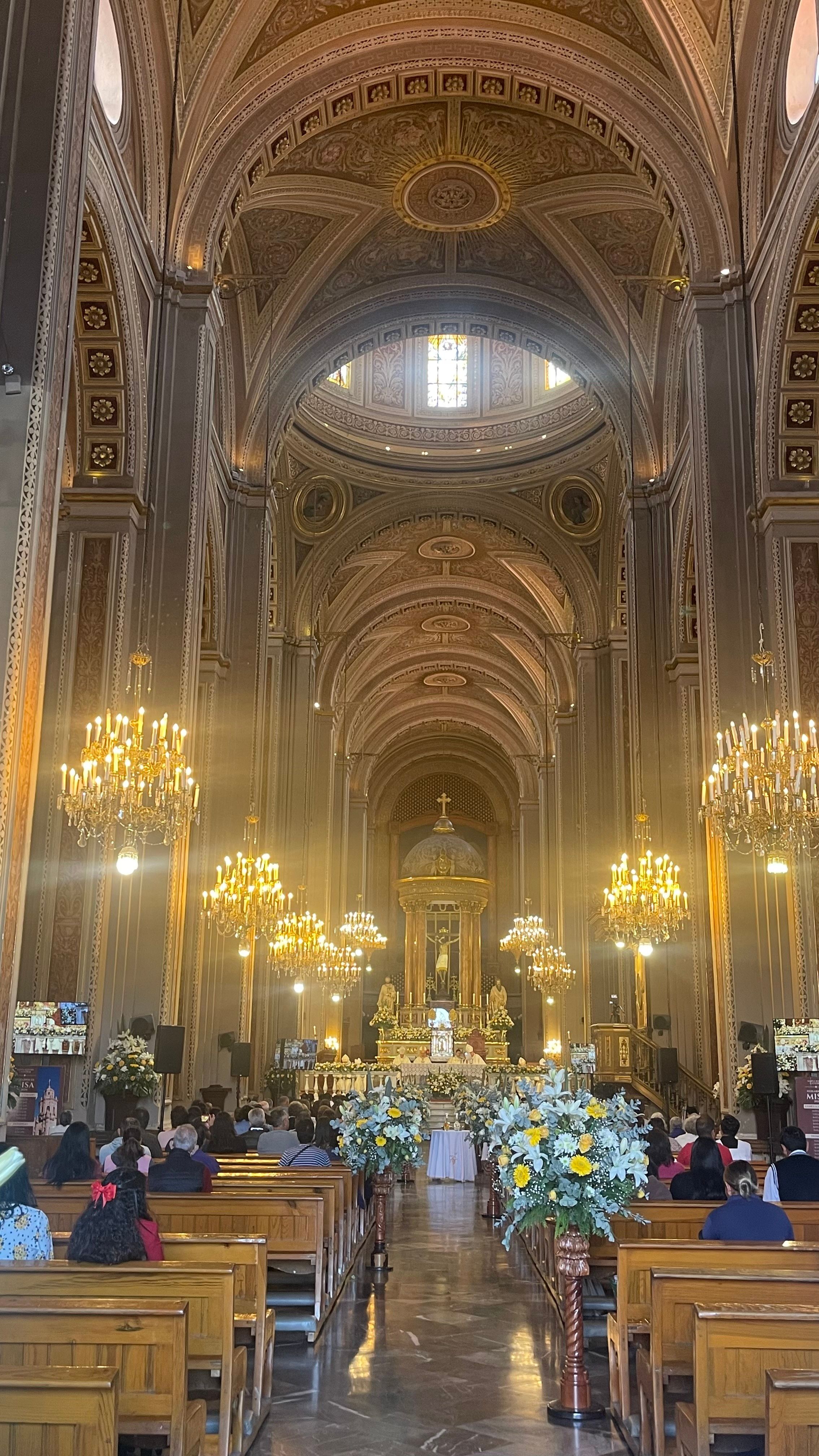 我走进大教堂,首先扑面而来的是一种金光在空气中漂浮的感觉。高高的穹顶与连续的拱形结构向前延伸,一层层向远方聚拢,像在引导视线直抵祭坛的中心。建筑内部的色调以金、褐和石灰色为主,华丽却不张扬,带着西班牙巴洛克式的庄严与墨西哥殖民时期的柔和。