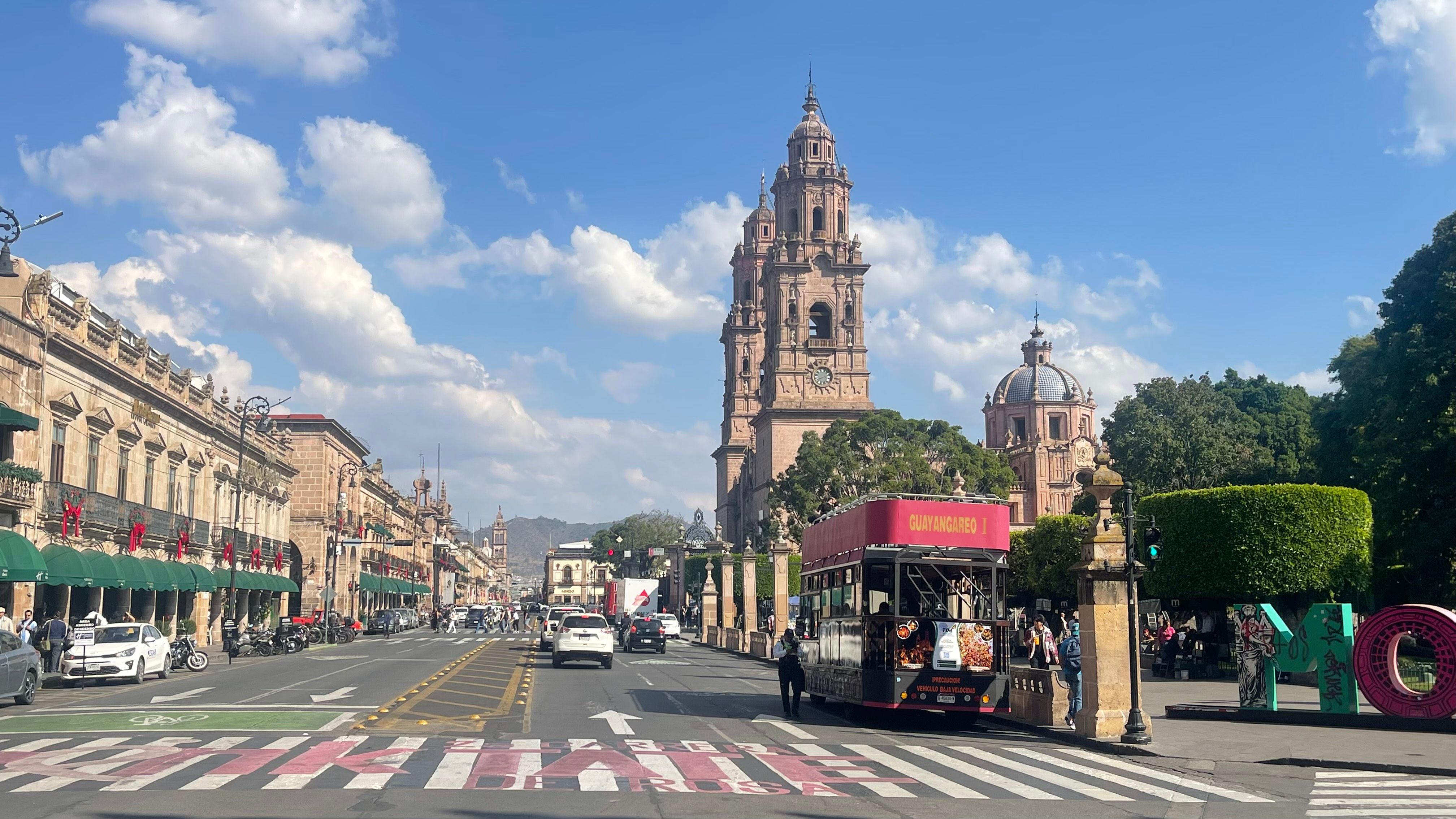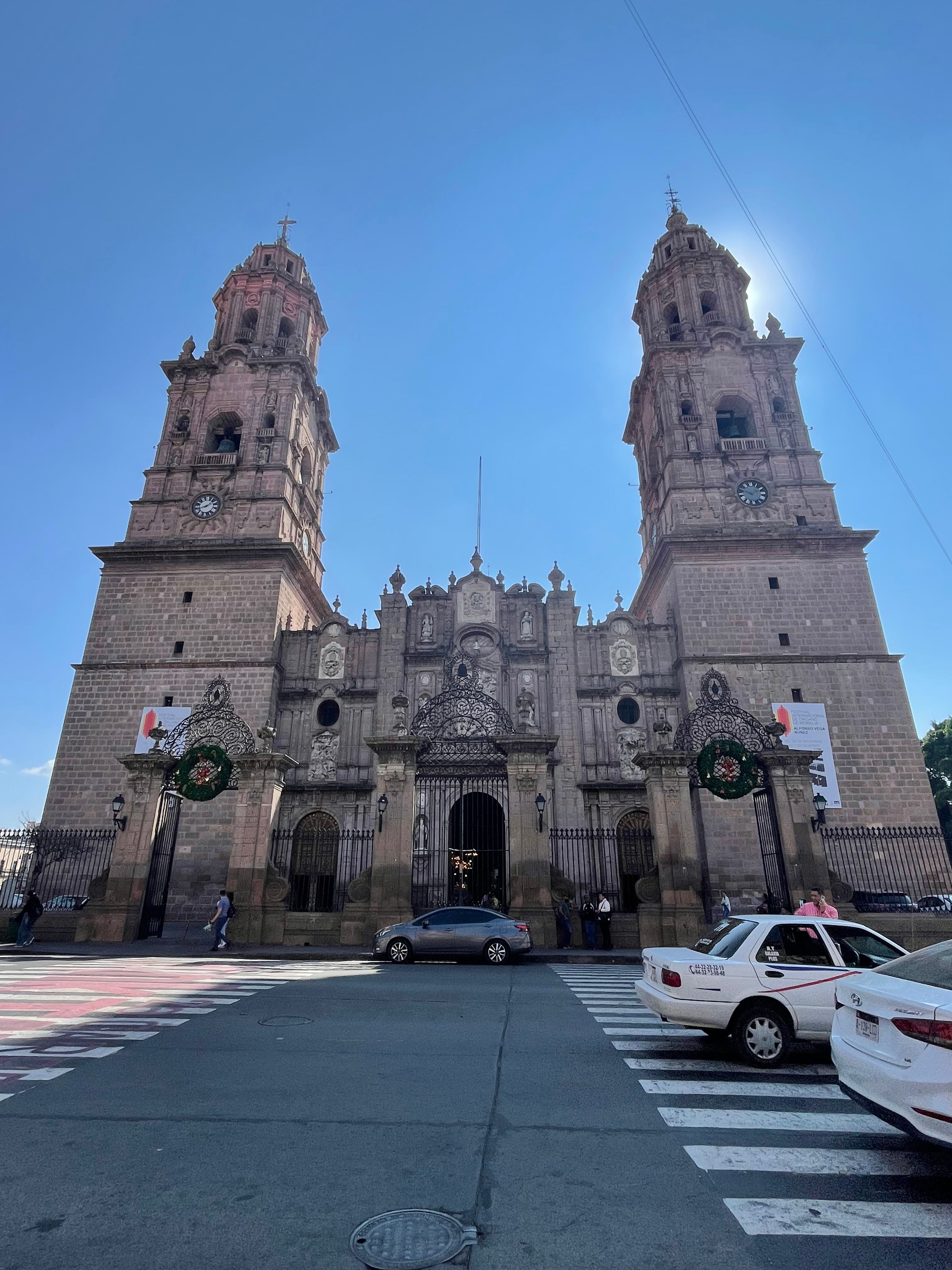 与墨西哥所有伟大的西班牙殖民城镇一样,一切都始于主广场和大教堂。莫雷利亚大教堂(La Catedral de Morelia)令人叹为观止。整座大教堂是红火山石头建造的。具有粉红色的色调,使其非常独特。教堂长96米,宽62米,它的两座钟楼高66.8米。在整个历史城区抬头一看就能看到,这是莫雷利亚最经典的天际线。 莫雷利亚大教堂被认为是墨西哥最美丽的大教堂之一,它耗时84年建成,始建于1660年,竣工于1744年。因为耗时太久,所以其建筑风格是巴洛克(塔楼)和新古典主义(教堂主立面)的混合式,是一张“时间的拼图”。据说教堂还有来自德国的管风琴。