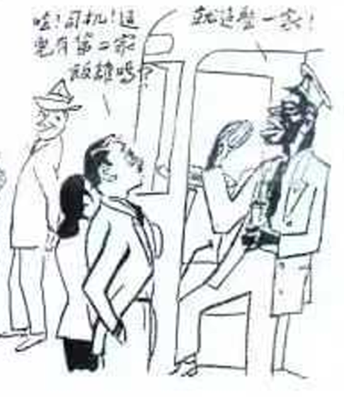 图3. 叶浅予漫画节选3这两口子恍然大悟,急忙跑过去问司机:附近还有没有招待有色人种的饭馆?回答是:没有!黑人司机吃的是自己带的午餐。