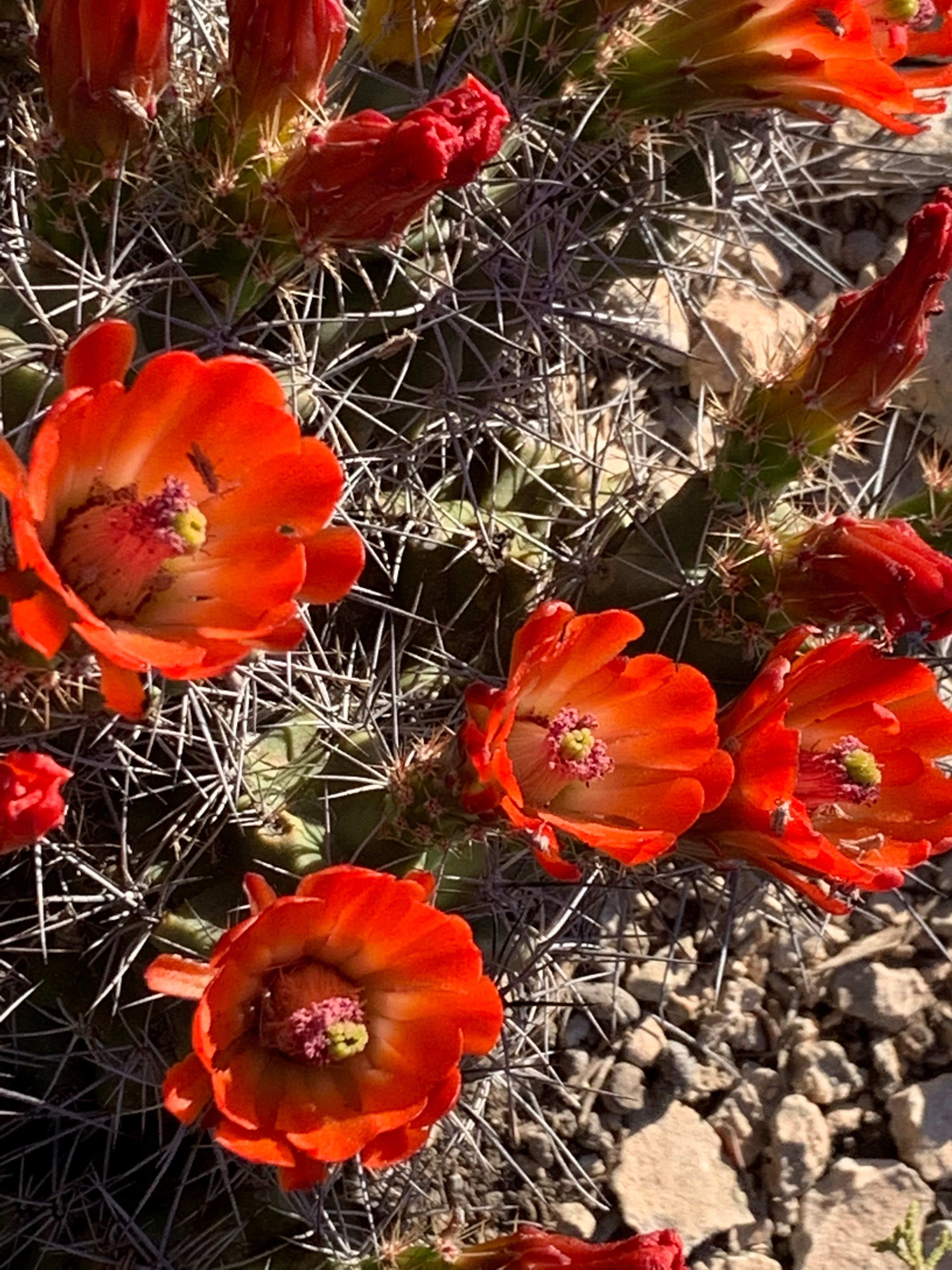 中途发现一小丛仙人球盛开的鲜花,那么鲜艳夺目。半年没下雨了,雪松在岩石缝里顽强地生长,向死而生。漫山遍野的仙人掌们早已经过了结果的季节。唯独这一簇仙人球在干旱中顽强的盛开,摄人心魄。